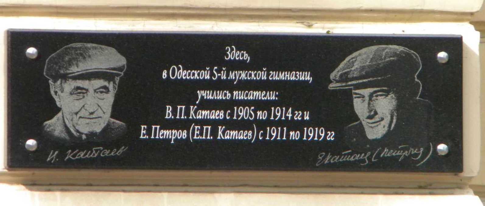 Живучи в Одесі, родина Катаєвих неодноразово змінювала адресу. На будинку за адресою: вул. Базарна, 4, де народився письменник, встановлено меморіальну табличку. На місці 5-ї чоловічої гімназії, в якій навчалися хлопчики, зараз розташований Одеський аграрний університет, на фасаді якого відкрито меморіальну дошку Валентину Катаєву та Євгену Петрову.