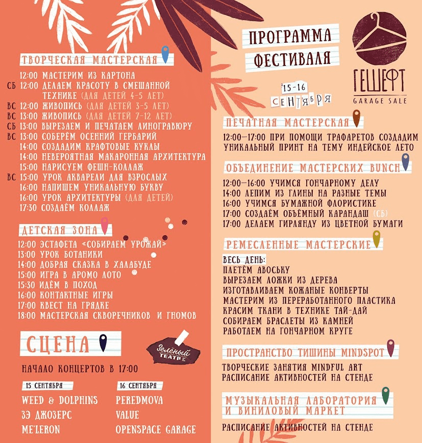 Вхід на закриту територію платний. Потрапляючи всередину, ви побачите прикрашену, яскраву, креативну локацію із зонами для відпочинку, столиками та “наметами” з різними товарами. За розкладом проводять майстер-класи для дітей та дорослих: рукоділля, малювання, гончарне мистецтво, кулінарні шедеври. Всі ці веселощі супроводжуються фоновою живою музикою.