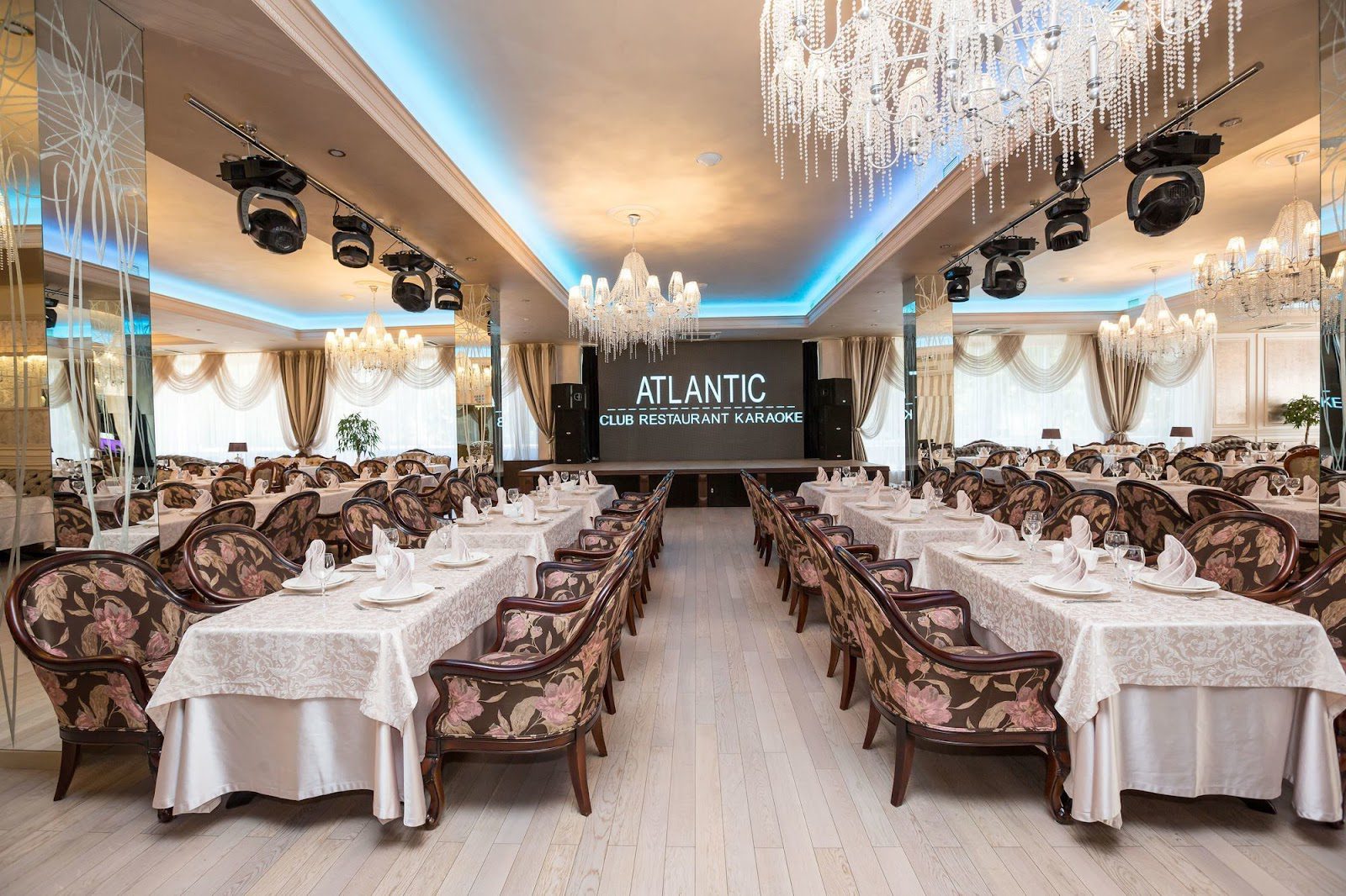 Ресторан «Atlantic Garden» розташований на території готельного комплексу з однойменною назвою. Він пропонує одеситам просторий банкетний зал, де можна провести будь-який важливий захід від весілля до ювілею. Інтер’єр у приміщенні оформлено в класичному стилі, він має ніжні пісочні відтінки, різьблені меблі з натурального дерева, дзеркальні колони та неонове підсвічування, а також великі кришталеві люстри, які підкреслюють розкіш. Просторий зал закладу, де встановлено сцену, сучасне музичне та світлове обладнання, танцмайданчик, вміщує до 500 персон.